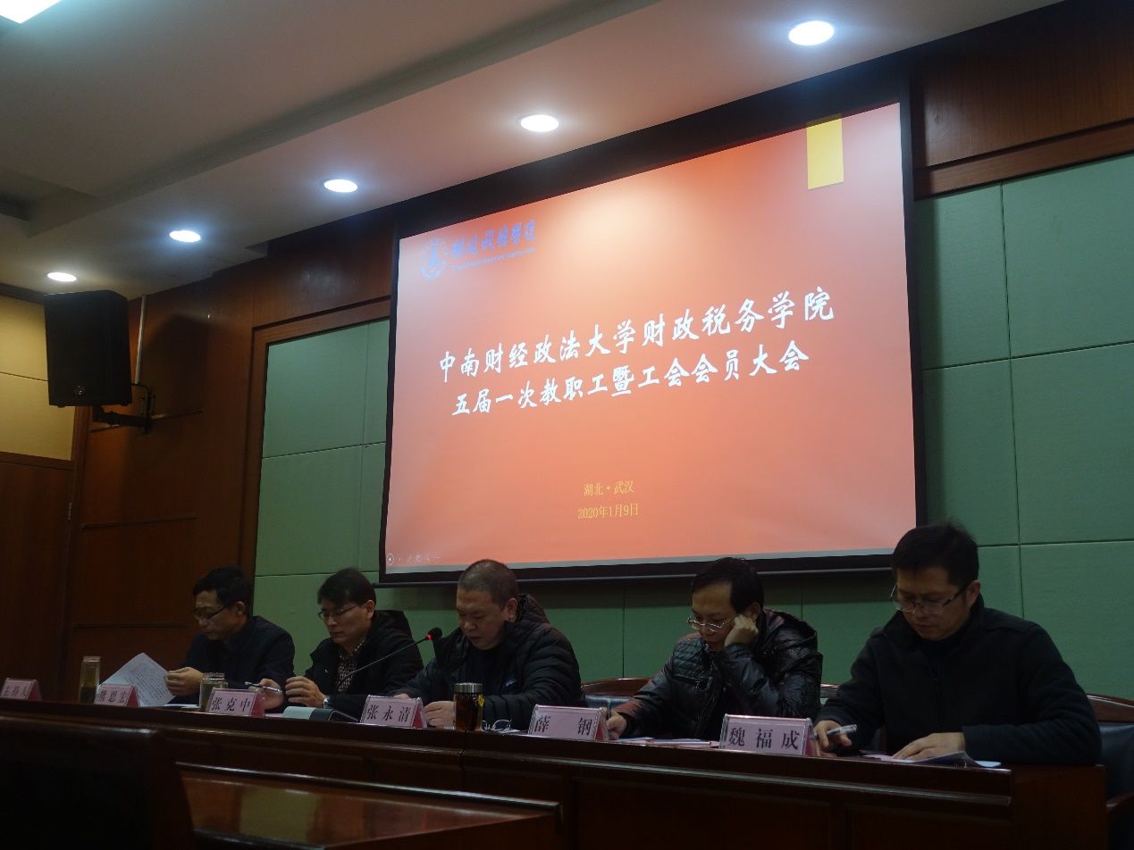 (通讯员:木拉提·依不拉音木江)1月9日下午,财政税务学院五届一次教职工暨工会会员大会在文泉楼四楼会议室顺利召开。院党委书记张永清、院长张克中、副书记熊思宏、副院长薛钢、魏福成出席了此次大会。张永清担任此次大会的主持人。