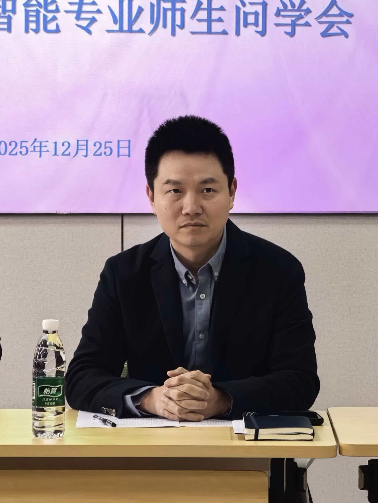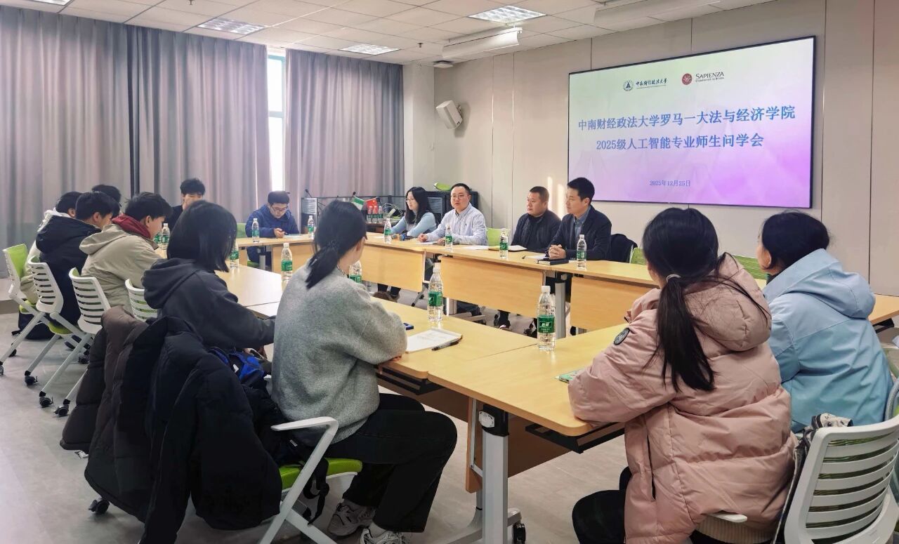 2025年12月25日上午,法与经济学院党委书记周俊杰、院长李俊与2025级人工智能专业学生代表举行 “师生问学”座谈会,深入了解学生入学以来的学习生活情况,倾听学生心声,回应学生关切。座谈会由学院学生办公室本科生辅导员田守顺主持。