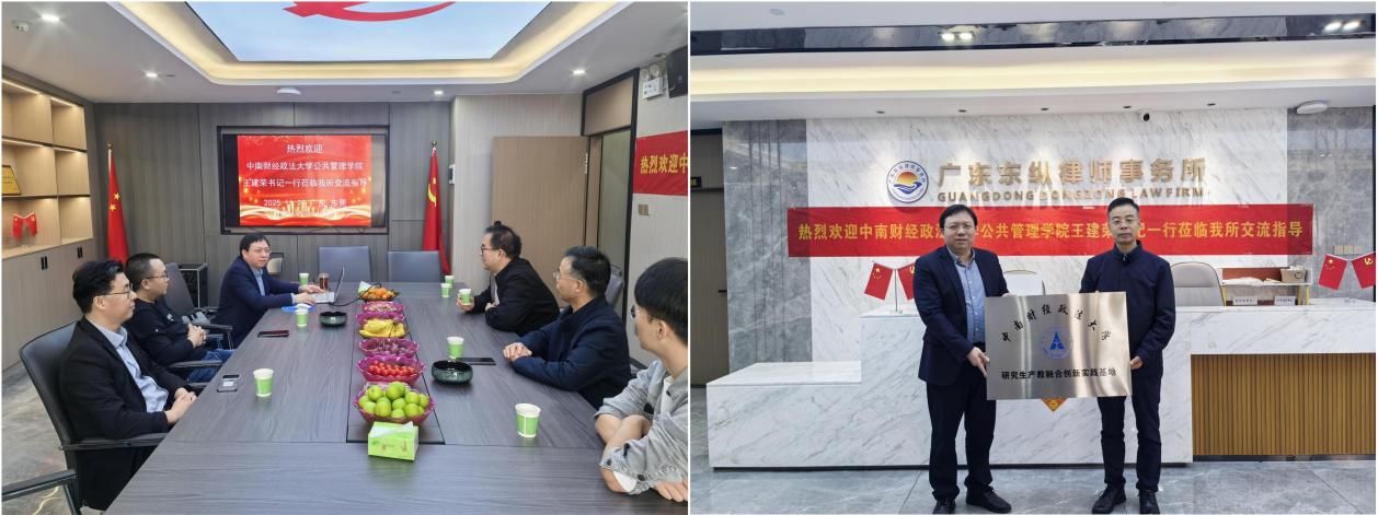 在由学院2002级行政管理专业、公共管理学院校友会副会长、东莞校友会理事许望平校友创立的广东东纵律师事务所处,双方就法学实践与公共管理人才培养交换意见,并同期举行“研究生产教融合创新实践基地”授牌仪式,为未来拓展合作领域奠定基础。