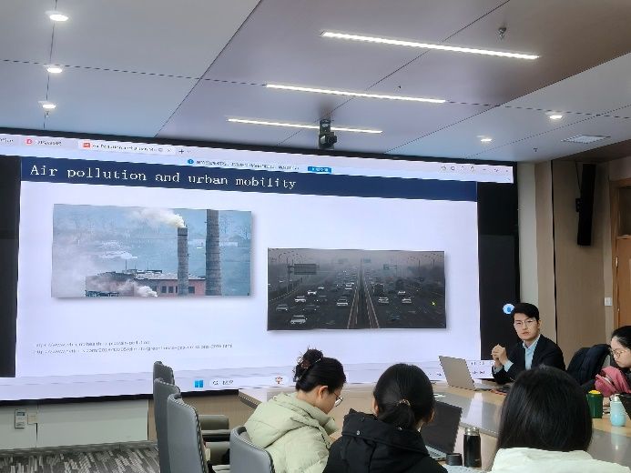 活动伊始,梁源博士从研究背景、理论框架与研究设计切入,围绕两项聚焦中国城市场景的准实验研究展开深度分享,系统解析空气污染与城市交通的双向因果关系。在第一项研究中,他创新性地将 “逆温现象” 作为衡量空气污染的工具变量,应用于城市交通领域的研究,通过严谨的实证分析,精准量化了空气污染对共享单车使用率的因果效应,为理解环境因素对居民出行选择的影响提供了全新视角。