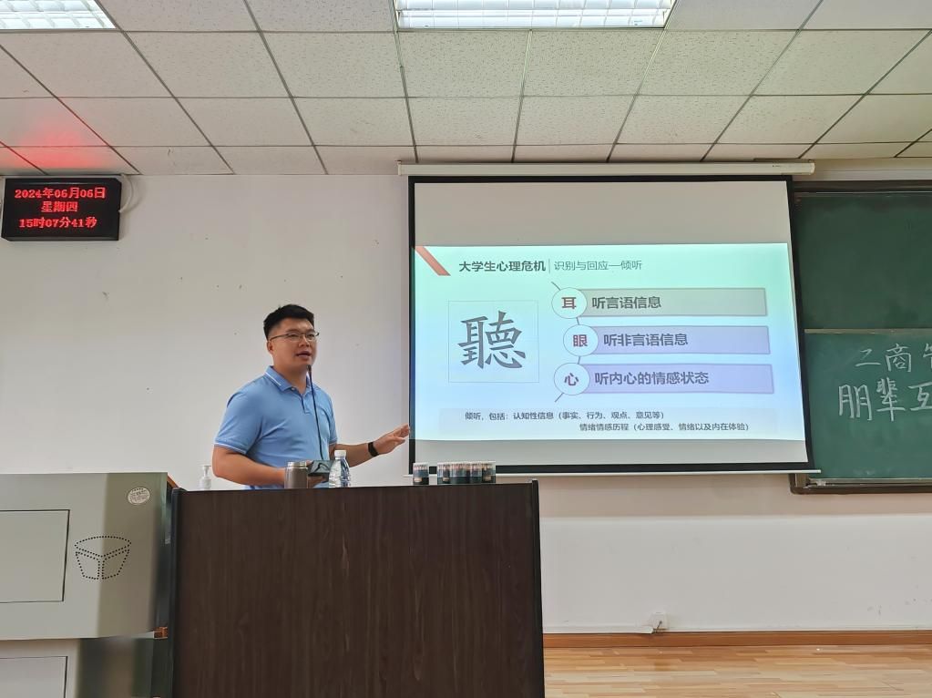 (通讯员:王臻 王茹钰 摄影:冯元煦 杨雯钧)心向阳光,晴满校园。为更好发挥学校四级心理预警机制,构建上下联动、高效衔接的心理健康教育工作格局,工商管理学院于6月6日在文润303教室举办朋辈互助心理技能专题讲座。本次讲座邀请我校心理中心青少年心理发展研究所专职教师、国家二级心理咨询师余金聪老师主讲,由工商管理学院本科2020级辅导员范梦宇老师主持,工商管理学院本科2023级全体班委及寝室长参加。