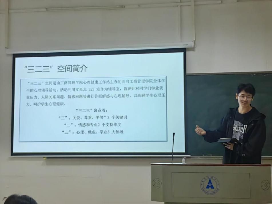 接下来,蔡佳欣同学首先对心理工作站进行总体介绍。她从工作机制系统、心理活动系统、咨询服务系统等多个方面对工商管理学院心理健康教育体系进行了初步的讲解。