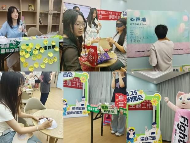 活动亮点纷呈,寓教于乐。游园会设置了多个特色心理互动区域,例如在“情绪疗愈岛”,同学们匿名写下烦恼或心愿,通过倾诉释放压力,并收获暖心回复;在“身体关怀站”,通过击打不倒翁释放情绪,品尝甜甜的小饮料和美味的零食;在“成长能量站”,通过绘画脸谱面具表达内心情感,艺术疗愈舒缓情绪。活动现场欢声笑语,同学们在轻松的氛围中学习心理健康知识,感受团队支持的力量。