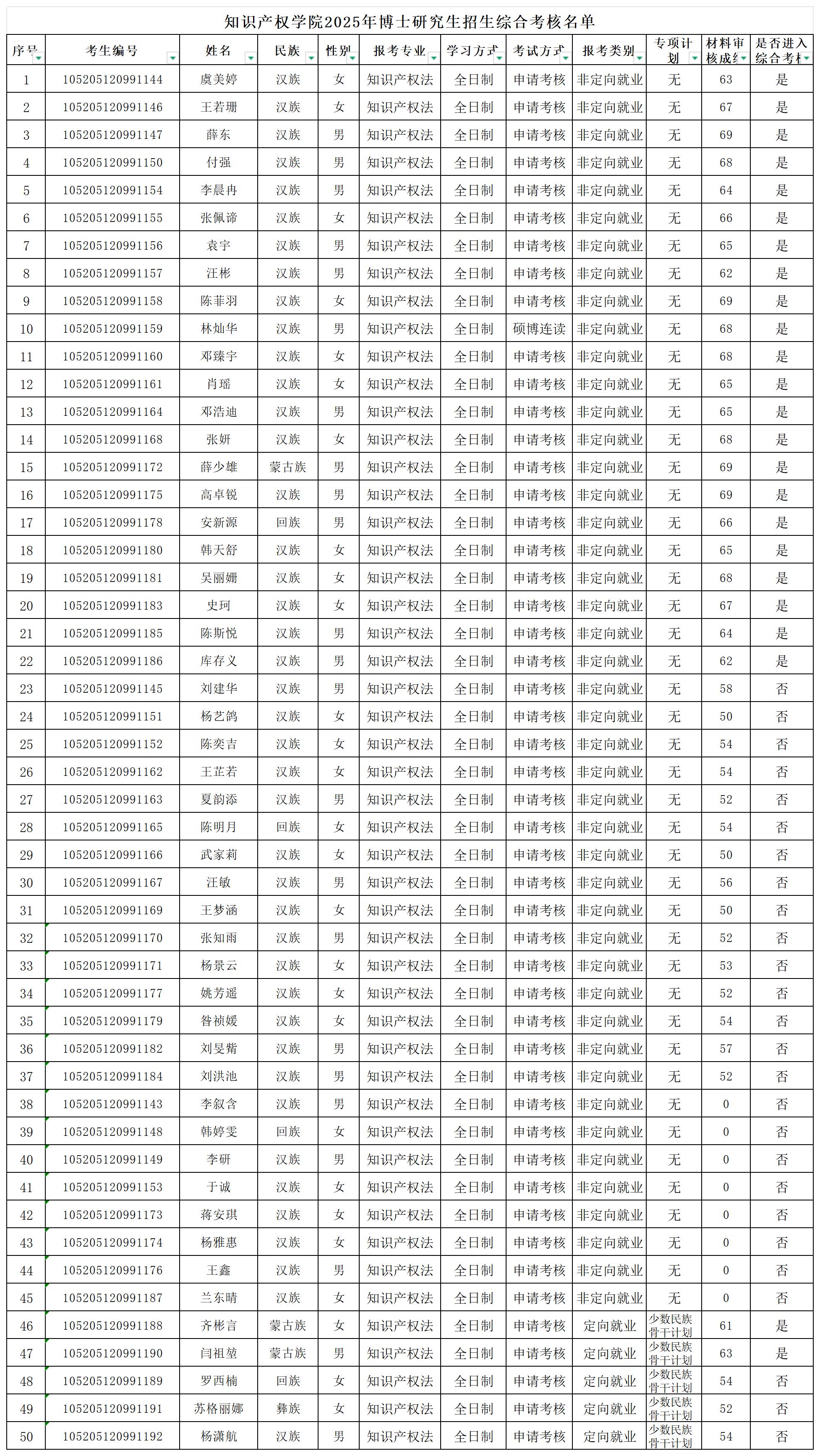 学院根据学校研究生院《关于做好2025年博士研究生招生录取工作的通知》和《知识产权学院2025年博士研究生招生实施细则》的工作要求,本着公平、公正、公开原则,经学院博士研究生招生工作领导小组审定,2025年博士研究生考核工作小组对50名“申请-考核”制和硕博连读博士研究生提交的报名信息进行全面、细致、严格的审核,现将通过资格审查的名单予以公示,不合格者不另行通知。
