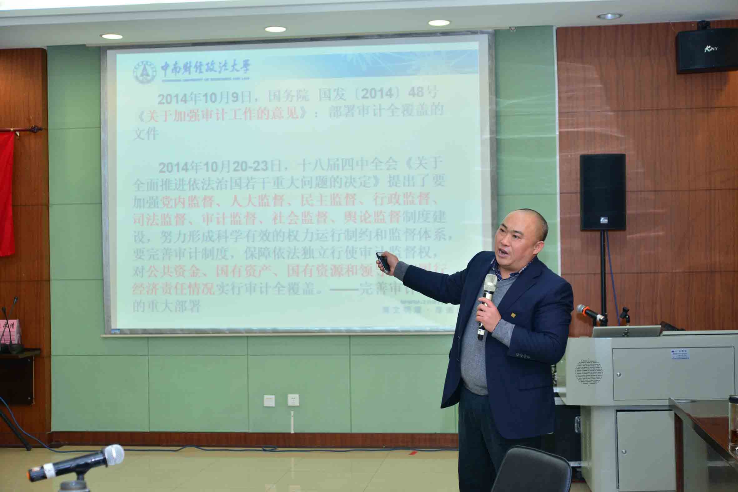 揭牌仪式结束后,张龙平教授作了题为《我国政府审计重大改革:文件规定与理论思考》的专题学术报告。张教授从对2014年10月9日国务院发布的《关于加强审计工作的意见》、十八届四中全会《关于全面推进依法治国若干重大问题的决定》中关于审计监督的表述、2015年12月8日“两办”发布的《关于完善审计制度若干重大问题的框架意见》等文件的解读入手,系统阐述了当前我国政府审计重大改革的八个方面内容,包括实行审计全覆盖、强化审计机关对下级审计机关的领导、探索省以下地方审计机关人财物管理改革、推进审计职业化建设、加强审计队伍思想和作风建设、建立健全履行法定审计职责保障机制、完善审计结果运用机制、加强对审计机关的监督等方面。听完张教授的学术报告,会计学院学术委员会主席张志宏教授说,非常高兴又领略了张龙平教授激情洋溢的学术报告风采,这个报告让大家更全面、更深入地了解到了政府审计的重大问题,对张龙平教授表示感谢,同时对基地今后的建设与发展致以良好的祝愿。