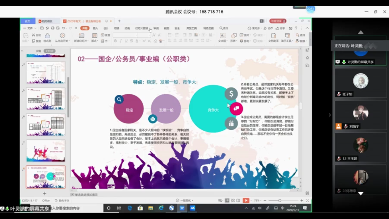 为进一步帮助同学们厘清职业发展方向,提高就业决策技能,明确就业目标,5月19日下午15:00,校友工作与社会合作部副部长、注会1701班成长导师万莉,为班级60名同学组织了第二期“友话职说”活动,特邀我校工商管理学院08届校友叶灵鹏老师“授业解惑”,为同学们带来了一堂精彩纷呈的网络就业指导课,活动由陈俊华老师主持。