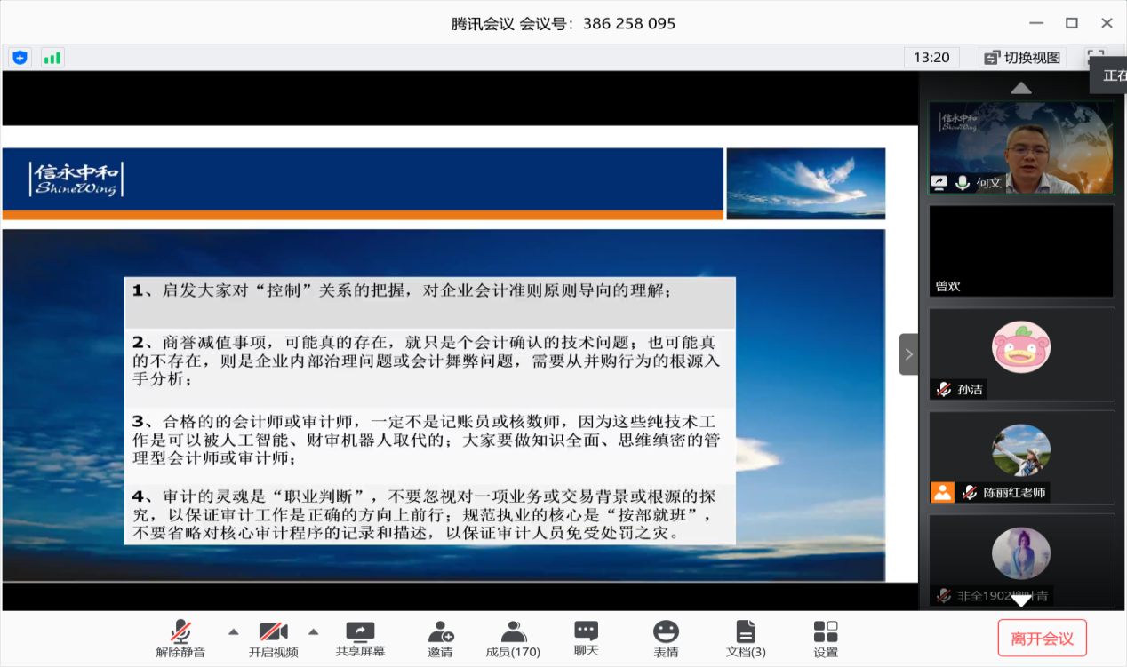 (通讯员:吴泳毅)2020年5月25日,已是新冠肺炎疫情防控的收尾巩固阶段,鏖战已久的疫情阻断了我院学生返校的脚步,但却无法阻绝同学们求学的热情。中国注册会计师协会执业会员、信永中和会计师事务所高级合伙人何文先生应我院陈丽红教授的邀请走进专业硕士课堂,在“腾讯会议”平台为大家讲述“另眼看商誉减值”。别开生面的授课吸引了我院众多师生前来学习。作为实务界的专家,何先生凭借过硬的专业素质和丰富的实战经验,结合数个生动的真实案例,来为学生们深入浅出地讲解商誉与长期股权投资的相关知识。本次课程由导师组组长陈丽红教授参与组织,讲座内容不仅与实际结合紧密,而且内容充实、语言简练,期间我院百余名学生也踊跃提问,展现出我院莘莘学子强烈的求知欲望与高涨的学习热情。