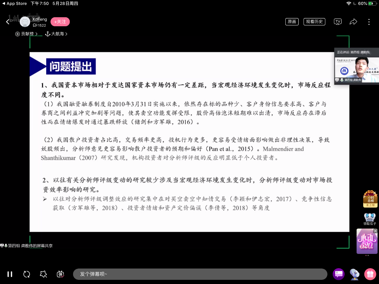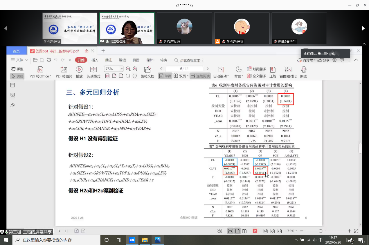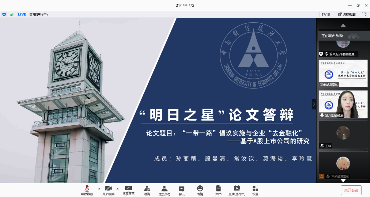 13篇论文依次进行答辩,作者们从课题背景、研究思路、研究方法,研究结论等方面做了阐述,论文答辩详实而精彩。论文既关注一带一路、突发性全球危机等经济形势,又聚焦短贷长投、实体企业金融化等财会热点,呈现出较高的专业素养和较强的创新意识,赢得了评审专家的一致好评,也让直播间里慕名学习的同学们获益匪浅。