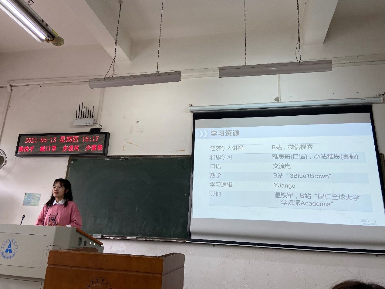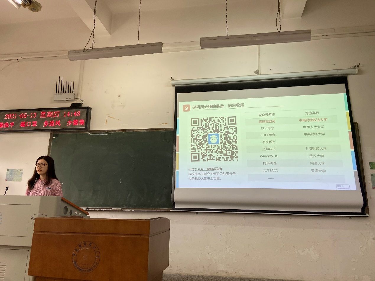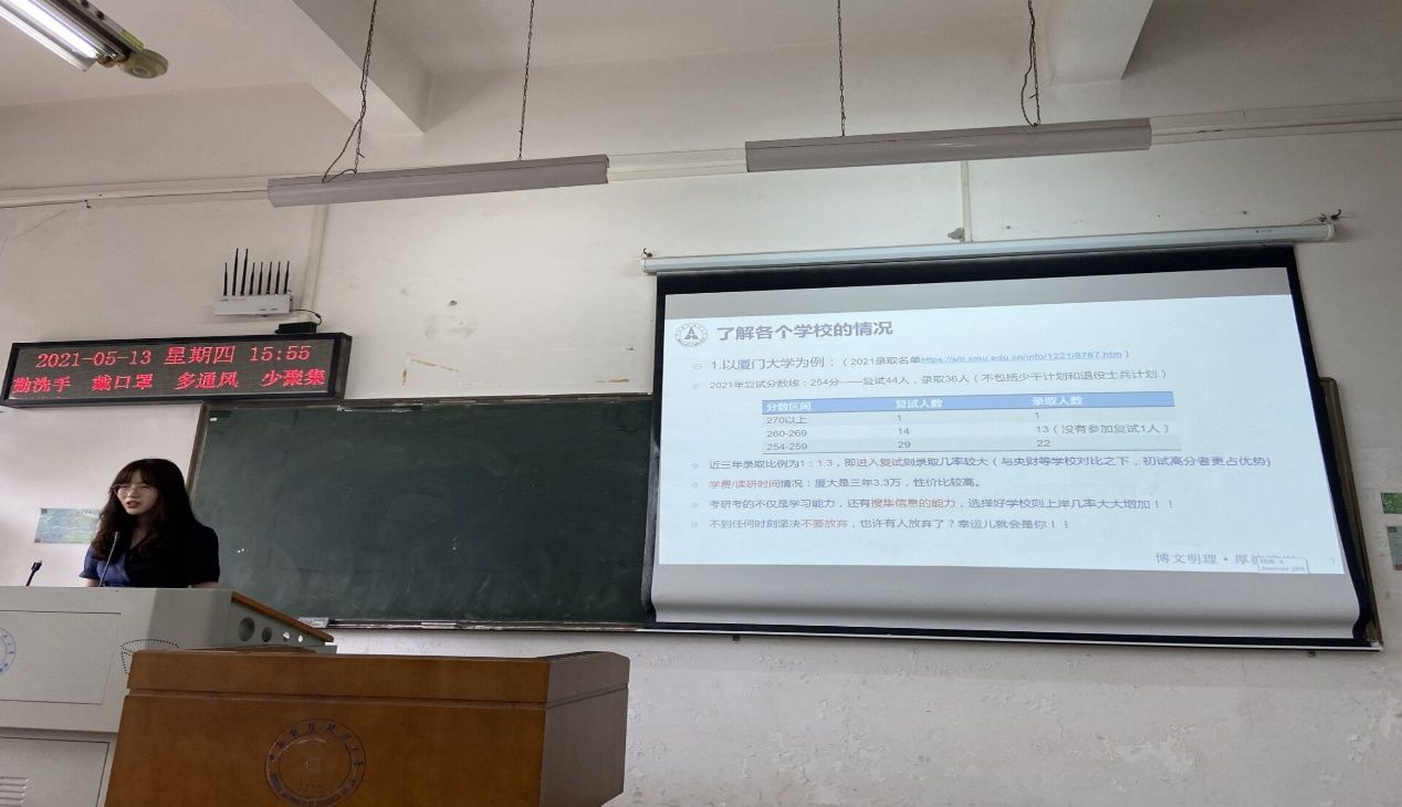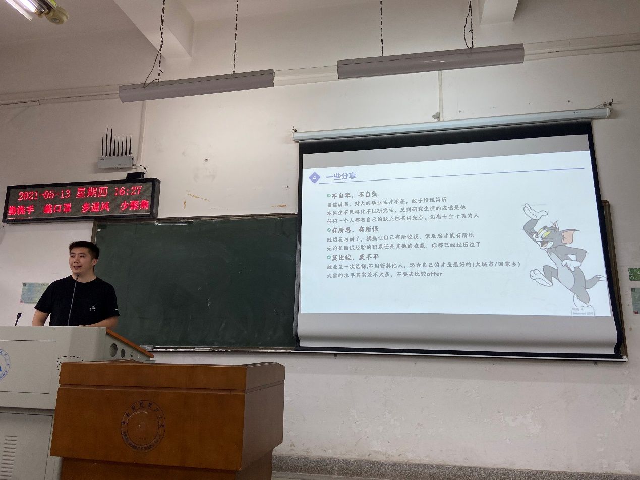 在第四个就业板块,拿到华为财经offer的冯享栋师兄首先分享,他以“每日三省吾身:考研?保研?就业?”为引子抛出问题,分享自己如何将一手不怎么样的牌打好的故事。他分析了所在班级的毕业去向数据,从自己的履历出发,分享了求职过程中如何提高自身竞争力、寻找实习,职位选择、面试准备、思考未来方向的方方面面,告诫同学们要“不自卑、不自负,有所思、有所悟,莫比较、莫不平”。