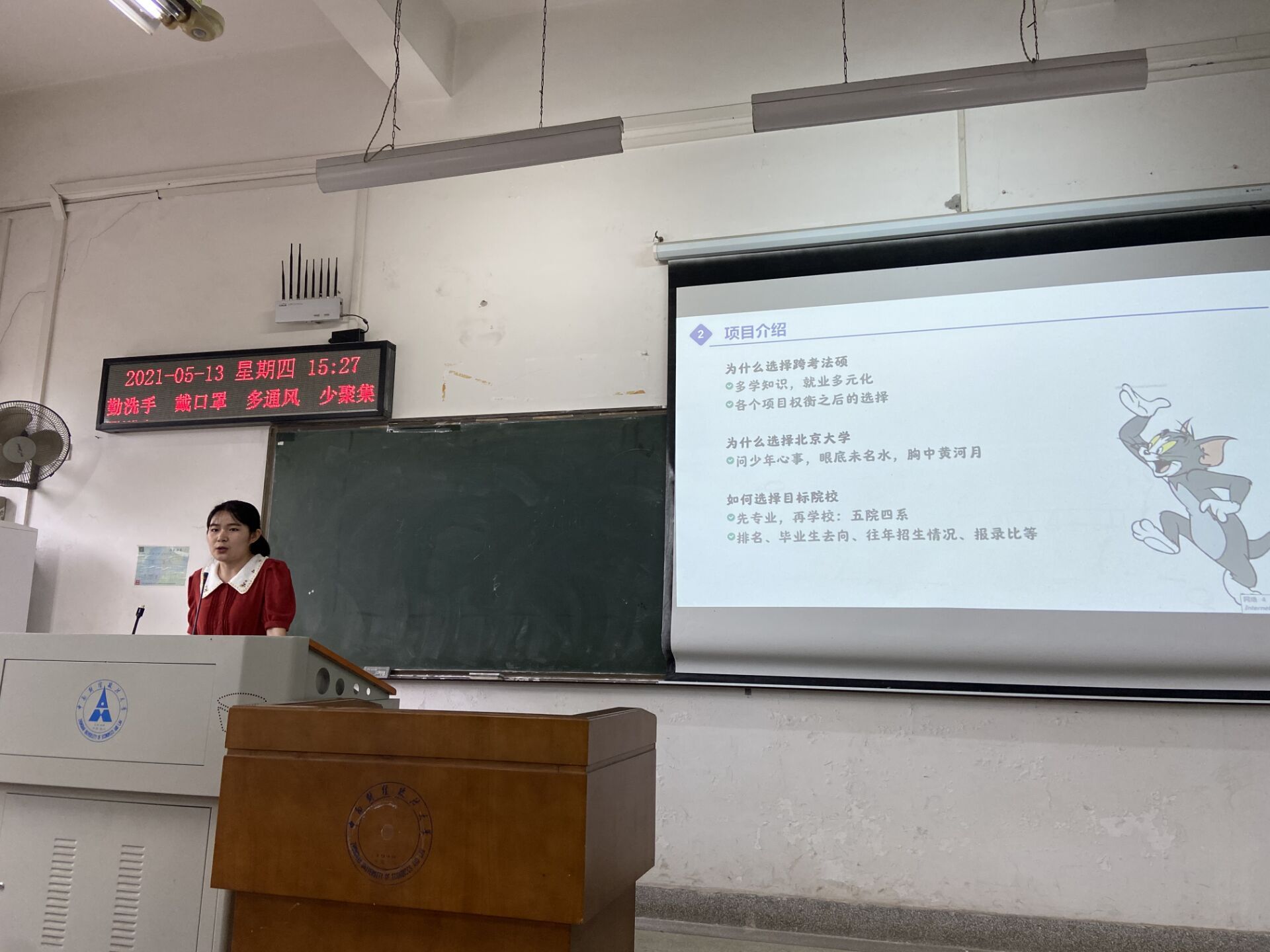 在第三个考研板块,第一位分享的是跨专业考研北京大学法律硕士的杜亚东师姐。她从项目选择和备考经验这两块展开,分享了自己为什么选择跨专业,为什么选择北大以及如何进行目标院校选择,除此之外,还分享了自己备考法硕的时间线、学习方法和复试经验等,同时她还以亲身经验告诉同学们既然做出了选择就要一往无前。