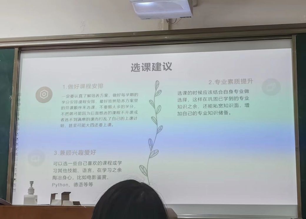 首先,王成龙老师幽默风趣地介绍了他的求学之路,并向我们简单地介绍了大学生活与高中以前生活的不同之处。他意味深长地叮嘱我们:要学会求助他人,学会独立与团队合作,为更优秀的自己而学习。接着,作为一个过来人,他详细为我们带来了选课建议,指引我们正确地做好大学四年的学习安排——在学好专业知识的基础上,兼顾兴趣爱好,全面提升综合能力。
