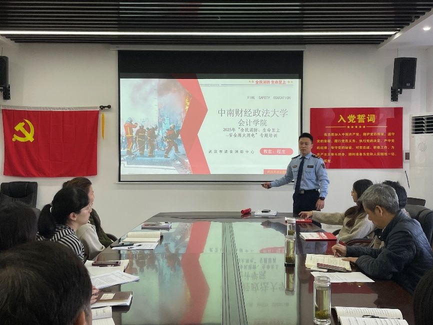 最后,武汉市进安消防中心的程龙教官为支部开展2025年“全民消防、生命至上——安全用火用电”专题培训,结合高校办公区域、校园生活场景的典型火灾案例,程教官用通俗易懂的语言详细讲解了火灾成因、初期火灾扑救技巧、疏散逃生注意事项等核心知识,重点强调了办公室电器设备规范使用、插线板安全隐患排查、消防器材正确操作等与日常工作密切相关的内容。培训提升了全员消防安全素养和应急处置能力,为学院高质量发展营造安全、稳定、和谐的良好环境。
