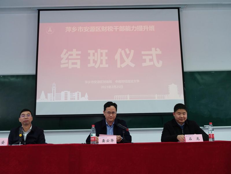 2023年2月25日下午,由江西省萍乡市安源区财政局主办,我校承办的“2023年安源区财税干部能力提升班”在首义校区圆满完成,共有59名学员顺利结业。萍乡市安源区委常委、区政府党组副书记、常务副区长龚云华,学校继续教育学院副院长石龙和萍乡市安源区财政局党组书记、局长吴雄姿出席了结业仪式。