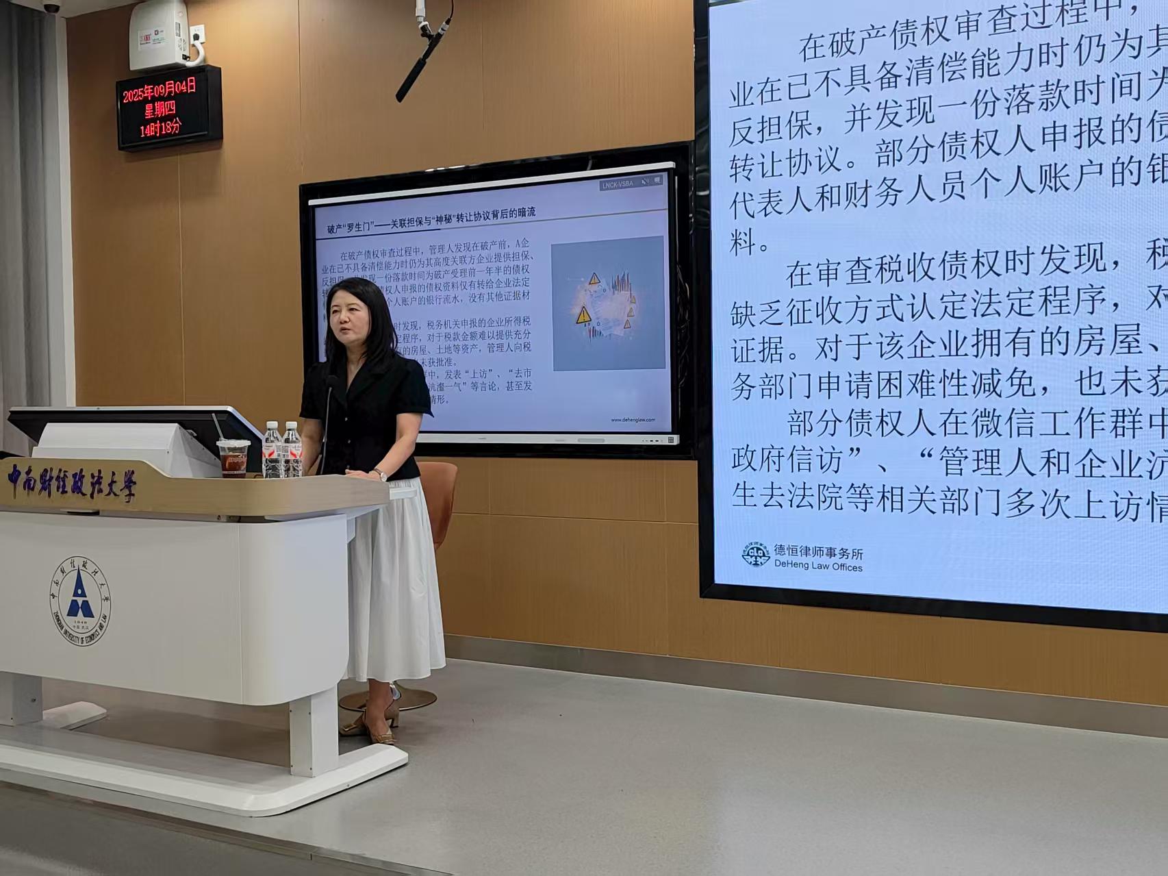 孙薇以实际案例切入,还原破产管理人赴任初期面临的资产隐匿、税务历史遗留问题等现实困局,引出破产律师需要兼具的法律、财务、经营三重能力。她指出,破产程序中“法律+财税”双线并进至关重要:通过合理规划欠税清偿顺序、化解资产处置税务风险,可最大化保护破产财产价值、提升破产成功率;而法律与企业管理的深度融合,可精准破解管理人深陷的名实错位、利益失衡、信息迷雾、信任危机等困境,帮助管理人化身利益协调中枢并快速构建合法性与管理实质性。最后,孙薇强调,一名成功的律师离不开强大的内心素质、出色的沟通能力、正确的职业观与价值观以及融通型的知识结构,希望同学们在校期要树立正确的价值观、努力丰富知识结构、锻炼自身能力,为步入社会打好坚实基础。
