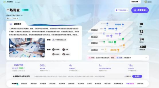 同时,课程搭载AI智能助教系统,7*24小时在线支持,系统实时采集过程性数据,实现教学反馈的精准化。自课程试运行以来,已累计服务6所高校505名学生,平台互动超1600次,408个优质的教学资源更让其成为兼具实用性与创新性的“数字资源宝库”。课程不仅让学生学会运用智能工具解决真实商业场景中的调查问题,更要培养其面向未来的AI素养与创新思维,最终在规模化教学中实现“因材施教”的个性化培养目标。