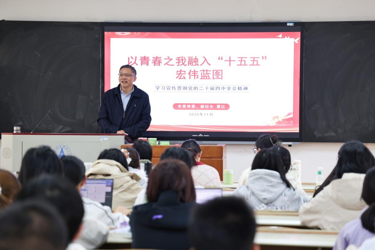 新闻网讯(通讯员 李成)11月11日上午,党委常委、副校长覃红在首义校区文泽楼305教室为会计学院本科生讲授《以青春之我融入“十五五”宏伟蓝图——学习宣传贯彻党的二十届四中全会精神》专题思政课,马克思主义学院部分青年教师参与现场观摩。