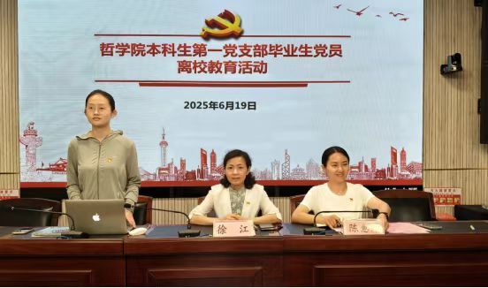 6月19日下午,哲学院本科生第一党支部在文沛楼二楼会议室开展了毕业生党员离校教育。哲学院党委副书记徐江,院团委书记、本科生第一党支部书记陈意萍以及支部全体党员参加了本次活动。全体人员重温入党誓词后,于汶翰、李嫚、毛乐、王崇存同学作为毕业生党员代表进行主题分享。陈意萍同志做党员组织关系转接培训,从概念定义、转接流程、注意事项等方面进行了全面介绍,确保支部毕业生党员组织关系顺利转接。徐江副书记讲授《贯彻中央八项规定 筑牢廉洁自律防线》毕业生离校教育专题党课,向毕业生党员介绍了八项规定主要内容、违反八项规定的典型案例及教训启示,为毕生党员在思想上“拧紧弦”,方向上“把好舵”,行动上“拉满弓”,鼓励同学们砥砺前行、迈向未来。活动最后,徐江副书记和陈意萍老师向同学们赠送了学院联合后保部在晓南湖旁亲自栽种的向日葵,祝贺同学们未来的日子向阳生花。