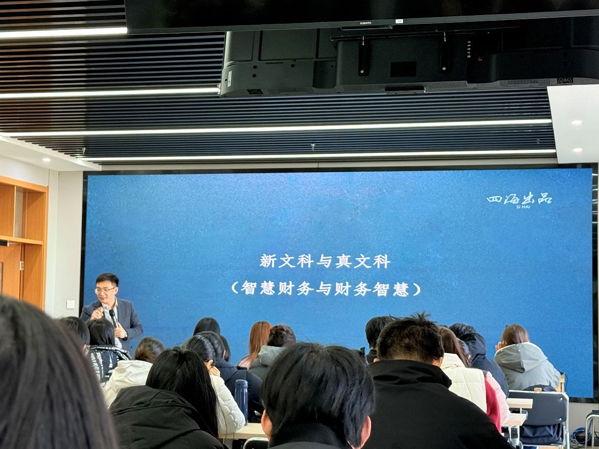 针对“新文科与真文科”的发展方向,强调文科教育应融入数据思维,推动学科交叉与实务衔接。他结合“智慧财务与财务智慧”的辩证关系,说明数据不仅赋能传统财务分析,更重塑决策心智模式。随后,他进一步从“语文与哲学”角度启发思考,提出“观察是否足以了解”“我有权做的一切是否都是对的”两个问题,引导在场同学反思数据伦理与决策责任,深化认知。