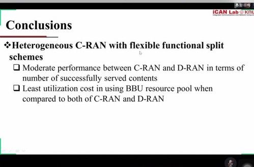 研究结果发现使用大规模MIMO以及28GHz毫米波的C-RAN网络性能表现良好;动态功能切分方案在优化BBU资源利用以及减少资源使用花费的方面有着积极作用。