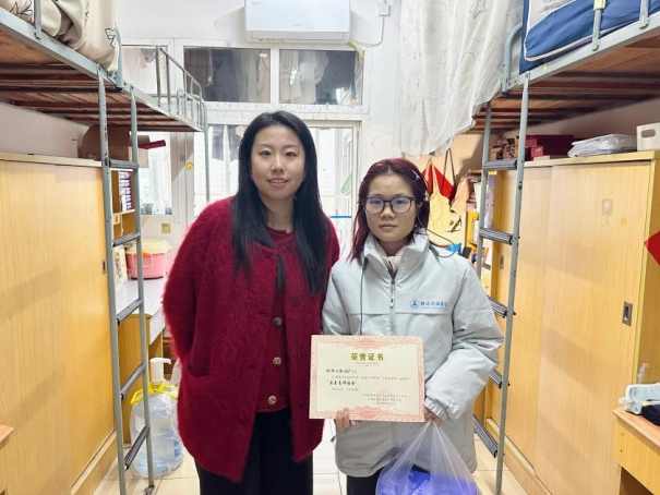 为深入践行“以学生为中心”的工作理念,巩固校级研究生“最美青研雅舍”评建成果,营造整洁雅致、积极向上的寝室文化氛围,1月4日下午,财政税务学院研究生辅导员钟唯老师、翟紫薇老师带队前往学院研究生寝室开展走访检查,并为获评校级“最美青研雅舍”的4间研究生寝室现场颁发奖状与奖品。